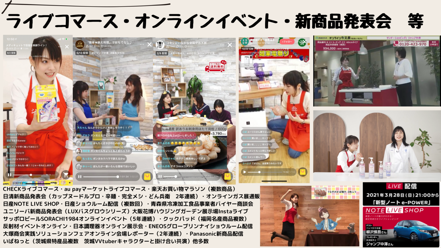 CHECKライブコマース・au payマーケットライブコマース・楽天お買い物マラソン(複数商品)日清新商品発表会(カップヌードルプロ・辛麺・完全メシ・どん兵衛 2年連続)・オンラインガス展通販/日産NOTE LIVE SHOP・日産ショウルーム配信(複数回)・青森県冷凍加工食品事業者バイヤー商談会/ユニリーバ新商品発表会(LUXバスグロウシリーズ)大阪花博ハウジングガーデン展示場Instaライブ/サッポロビールSORACHI1984オンラインイベント(5年連続)・クックパッド(福岡名産商品複数)/反射材イベントオンライン2022・反射材イベントオンライン2024日本調理器オンライン展示会・ENEOSグローブリンナイショウルーム配信/大塚商会実践ソリューションフェアオンライン会場レポーター(2年連続)・Panasonic新商品配信/いばねっと(茨城県特産品複数 茨城VVtuberキャラクターと掛け合い共演)他多数