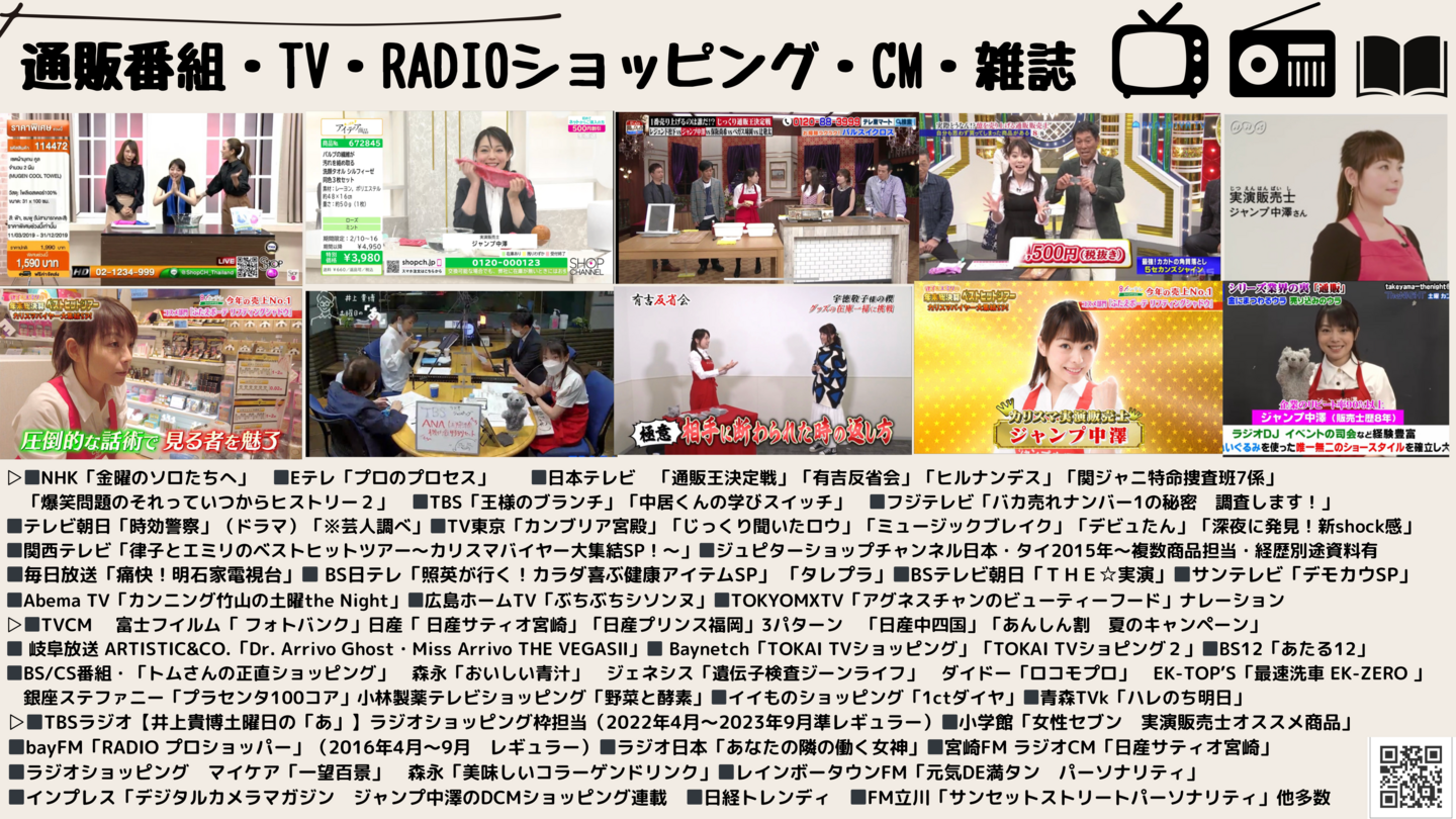 ◼️NHK「金曜のソロたちへ」 ◼️Eテレ「プロのプロセス」 ◼️日本テレビ 「通販王決定戦」「有吉反省会」「ヒルナンデス」「関ジャニ特命捜査班7係」「爆笑問題のそれっていつからヒストリー2」 ◼️TBS「王様のブランチ」「中居くんの学びスイッチ」 ◼️フジテレビ「バカ売れナンバー1の秘密 調査します!」◼️テレビ朝日「時効警察」(ドラマ)「※芸人調べ」◼️TV東京「カンブリア宮殿」「じっくり聞いたロウ」「ミュージックブレイク」「デビュたん」「深夜に発見!新shock感」 ◼️関西テレビ「律子とエミリのベストヒットツアー~カリスマバイヤー大集結SP!~」◼️ジュピターショップチャンネル日本・タイ2015年〜複数商品担当・経歴別途資料有◼️毎日放送「痛快!明石家電視台」◼️ BS日テレ「照英が行く!カラダ喜ぶ健康アイテムSP」 「タレプラ」◼️BSテレビ朝日「THE☆実演」◼️サンテレビ「デモカウSP」◼️Abema TV「カンニング竹山の土曜the Night」◼️広島ホームTV「ぶちぶちシソンヌ」◼️TOKYOMXTV「アグネスチャンのビューティーフード」ナレーション◼️ 岐阜放送 ARTISTIC&CO.「Dr. Arrivo Ghost・Miss Arrivo THE VEGASⅡ」◼️ Baynetch「TOKAI TVショッピング」「TOKAI TVショピング2」◼️BS12「あたる12」◼️BS/CS番組・「トムさんの正直ショッピング」 森永「おいしい青汁」 ジェネシス「遺伝子検査ジーンライフ」 ダイドー「ロコモプロ」 EK-TOP’S「最速洗車 EK-ZERO 」銀座ステファニー「プラセンタ100コア」小林製薬テレビショッピング「野菜と酵素」◼️イイものショッピング「1ctダイヤ」◼️青森TVk「ハレのち明日」 他多数