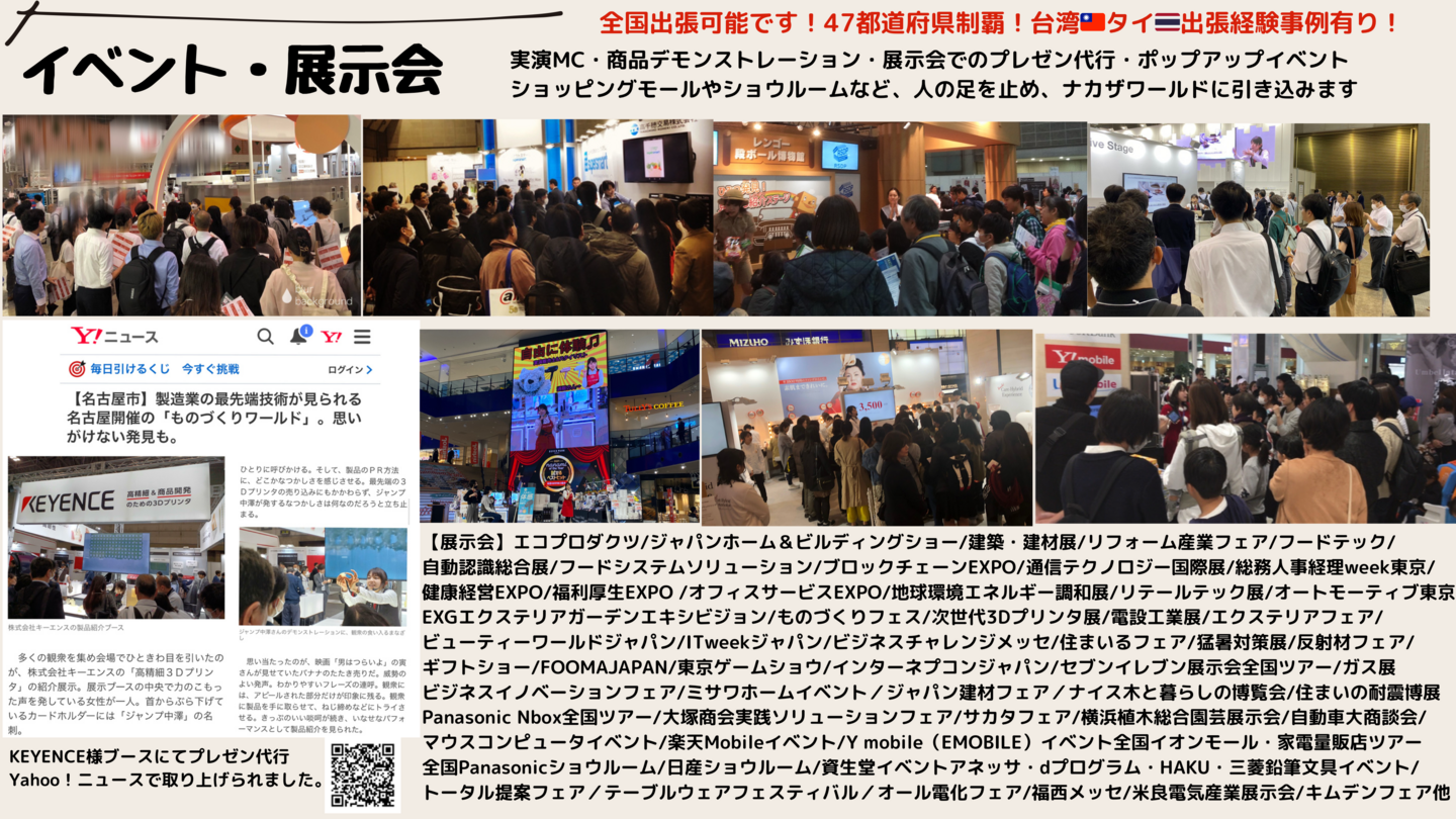 エコプロダクツ/ジャパンホーム&ビルディングショー/建築・建材展/リフォーム産業フェア/フードテック/自動認識総合展/フードシステムソリューション/ブロックチェーンEXPO/通信テクノロジー国際展/総務人事経理week東京/健康経営EXPO/福利厚生EXPO /オフィスサービスEXPO/地球環境エネルギー調和展/リテールテック展/オートモーティブ東京/EXGエクステリアガーデンエキシビジョン/ものづくりフェス/次世代3Dプリンタ展/電設工業展/エクステリアフェア/ビューティーワールドジャパン/ITweekジャパン/ビジネスチャレンジメッセ/住まいるフェア/猛暑対策展/反射材フェア/ギフトショー/FOOMAJAPAN/東京ゲームショウ/インターネプコンジャパン/セブンイレブン展示会全国ツアー/ガス展/ビジネスイノベーションフェア/ミサワホームイベント/ジャパン建材フェア/ナイス木と暮らしの博覧会/住まいの耐震博展/Panasonic Nbox全国ツアー/大塚商会実践ソリューションフェア/サカタフェア/横浜植木総合園芸展示会/自動車大商談会/マウスコンピュータイベント/楽天Mobileイベント/Y mobile(EMOBILE)イベント全国イオンモール・家電量販店ツアー/全国Panasonicショウルーム/日産ショウルーム/資生堂イベントアネッサ・dプログラム・HAKU・三菱鉛筆文具イベント/トータル提案フェア/テーブルウェアフェスティバル/オール電化フェア/福西メッセ/米良電気産業展示会/キムデンフェア他多数
