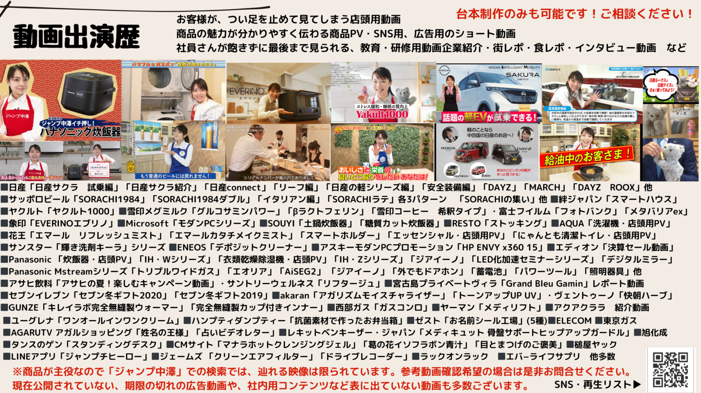 ◼️日産「日産サクラ 試乗編」「日産サクラ紹介」「日産connect」「リーフ編」「日産の軽シリーズ編」「安全装備編」「DAYZ」「MARCH」「DAYZ ROOX」他◼️サッポロビール「SORACHI1984」「SORACHI1984ダブル」「イタリアン編」「SORACHIラテ」各3パターン 「SORACHIの集い」他 ◼️絆ジャパン「スマートハウス」◼️ヤクルト「ヤクルト1000」◼️雪印メグミルク「グルコサミンパワー」「βラクトフェリン」「雪印コーヒー 希釈タイプ」・富士フイルム「フォトバンク」「メタバリアex」◼️象印「EVERINOエブリノ」◼️Microsoft「モダンPCシリーズ」◼️SOUYI「土鍋炊飯器」「糖質カット炊飯器」◼️RESTO「ストッキング」◼️AQUA「洗濯機・店頭用PV」◼️花王「エマール リフレッシュミスト」「エマールカタチメイクミスト」「スマートホルダー」「エッセンシャル・店頭用PV」「にゃんとも清潔トイレ・店頭用PV」◼️サンスター「輝き洗剤キーラ」シリーズ ◼️ENEOS「デポジットクリーナー」◼️アスキーモダンPCプロモーション「HP ENVY x360 15」◼️エディオン「決算セール動画」◼️Panasonic 「炊飯器・店頭PV」「IH・Wシリーズ」「衣類乾燥除湿機・店頭PV」「IH・Zシリーズ」「ジアイーノ」「LED化加速セミナーシリーズ」「デジタルミラー」◼️Panasonic Mstreamシリーズ「トリプルワイドガス」「エオリア」「AiSEG2」 「ジアイーノ」「外でもドアホン」「蓄電池」「パワーツール」「照明器具」他◼️アサヒ飲料「アサヒの夏!楽しむキャンペーン動画」・サントリーウェルネス「リフタージュ」◼️宮古島プライベートヴィラ「Grand Bleu Gamin」レポート動画◼️セブンイレブン「セブン冬ギフト2020」「セブン冬ギフト2019」◼️akaran「アガリズムモイスチャライザー」「トーンアップUP UV」・ヴェントゥーノ「快朝ハーブ」◼️GUNZE「キレイラボ完全無縫製ウォーマー」「完全無縫製カップ付きインナー」◼️西部ガス「ガスコンロ」◼️ヤーマン「メディリフト」◼️アクアクララ 紹介動画◼️ユーグレナ「ワンオールインワンクリーム」◼️ハンプティダンプティー「抗菌素材で作ったお弁当箱」◼️ゼスト「お名前シール工場」(5種)◼️ELECOM ◼️東京ガス◼️AGARUTV アガルショッピング「姓名の王様」「占いビデオレター」◼️レキットベンキーザー・ジャパン「メディキュット 骨盤サポートヒップアップガードル」◼️旭化成◼️タンスのゲン「スタンディングデスク」◼️CMサイト「マナラホットクレンジングジェル」「葛の花イソフラボン青汁」「目とまつげのご褒美」◼️槌屋ヤック◼️LINEアプリ「ジャンプチヒーロー」◼️ジェームズ 「クリーンエアフィルター」「ドライブレコーダー」◼️ラックオンラック ◼️エバ−ライフサプリ 他多数